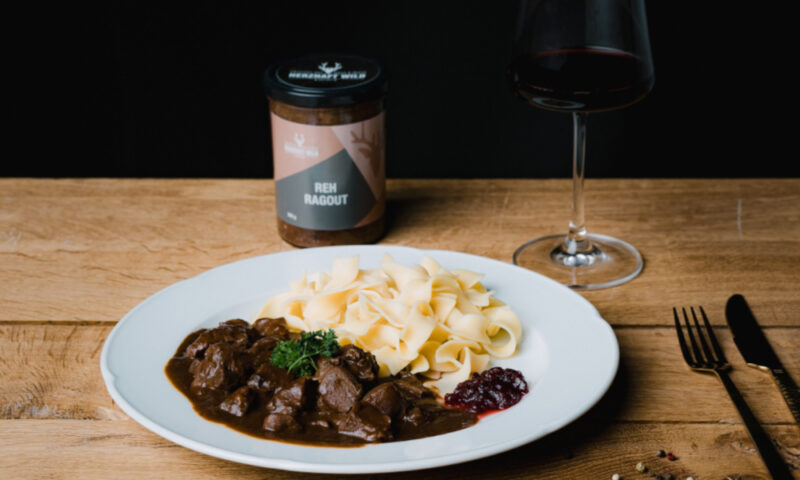 Herzhaftes Rehragout, genussfertig im Glas. Dazu feine Nudeln, Semmelknödel und Preiselbeeren. Ein Festtagsessen für zu Hause.
